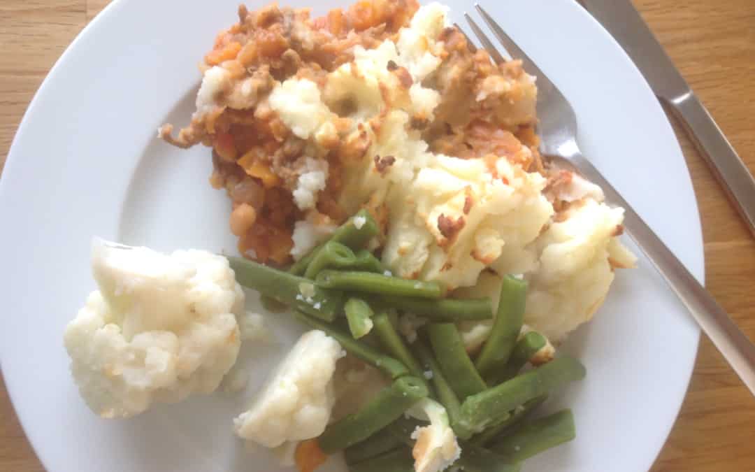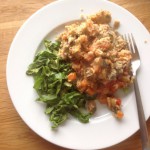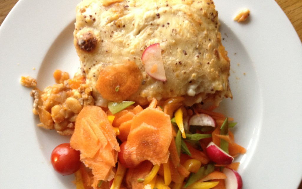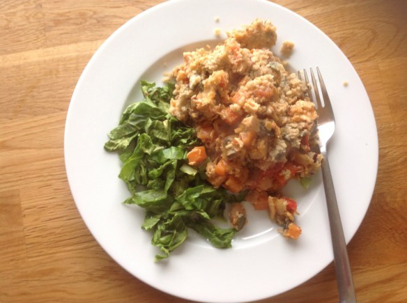 Vegetable Crumble. Root veg in a tomato sauce, topped with oats, cheese and salted peanuts