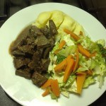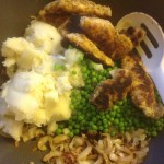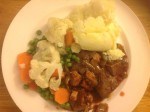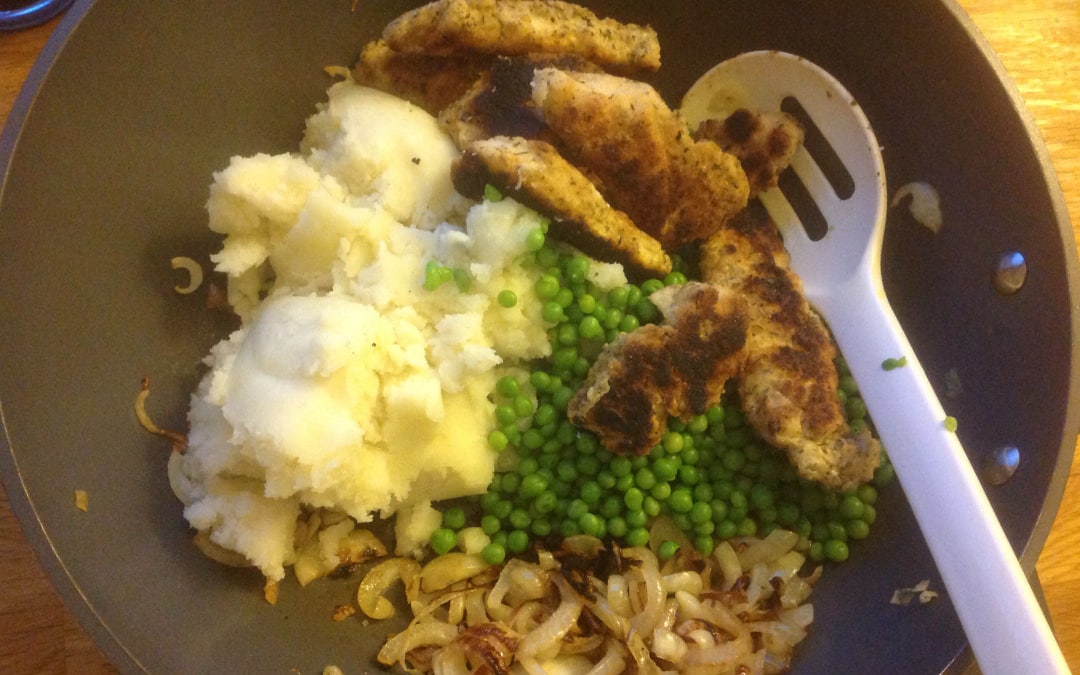Liver and Onions, mash, carrots and peas, 66p a serving
