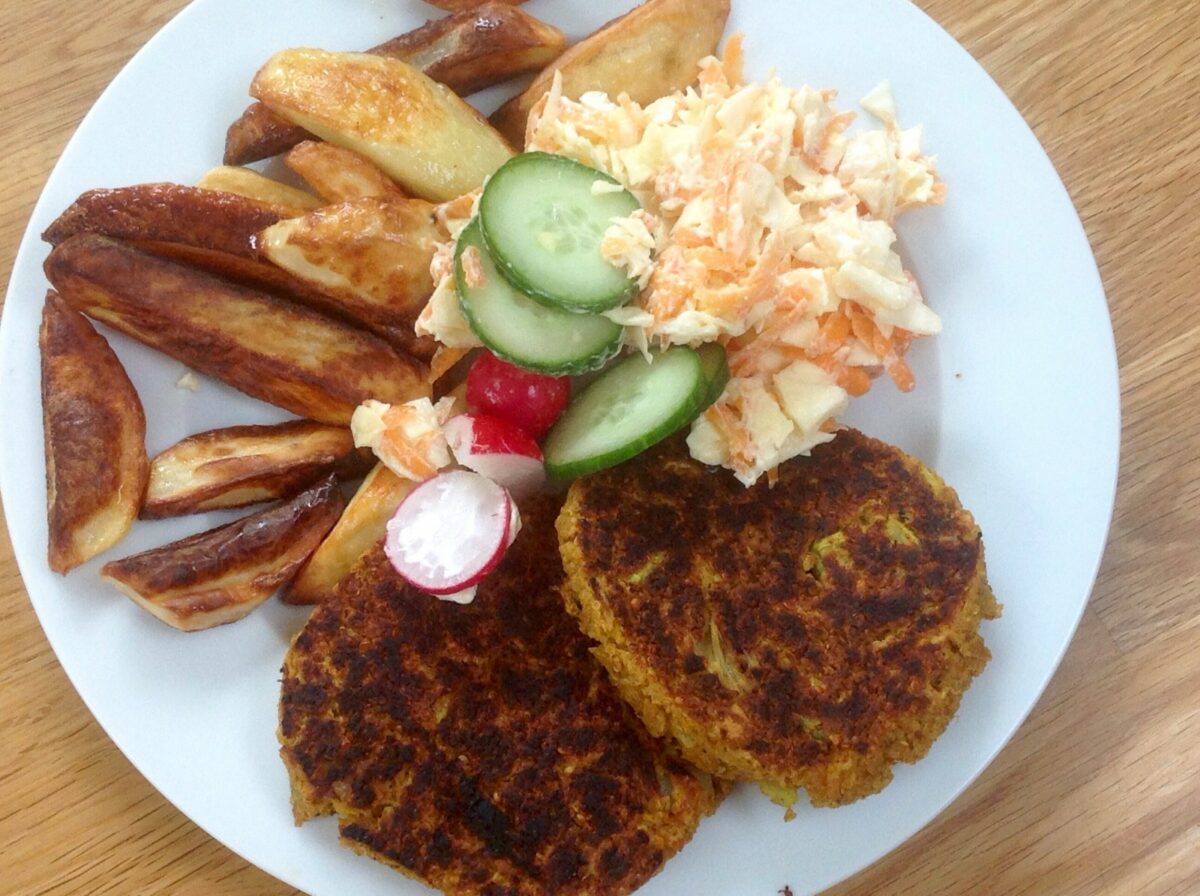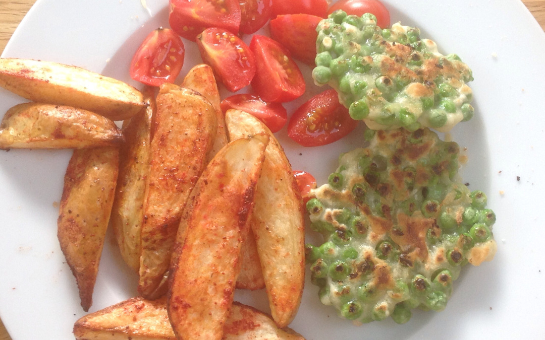 Vegan sweetcorn fritters, with peas, oven wedges and ketchup, on a glass plate