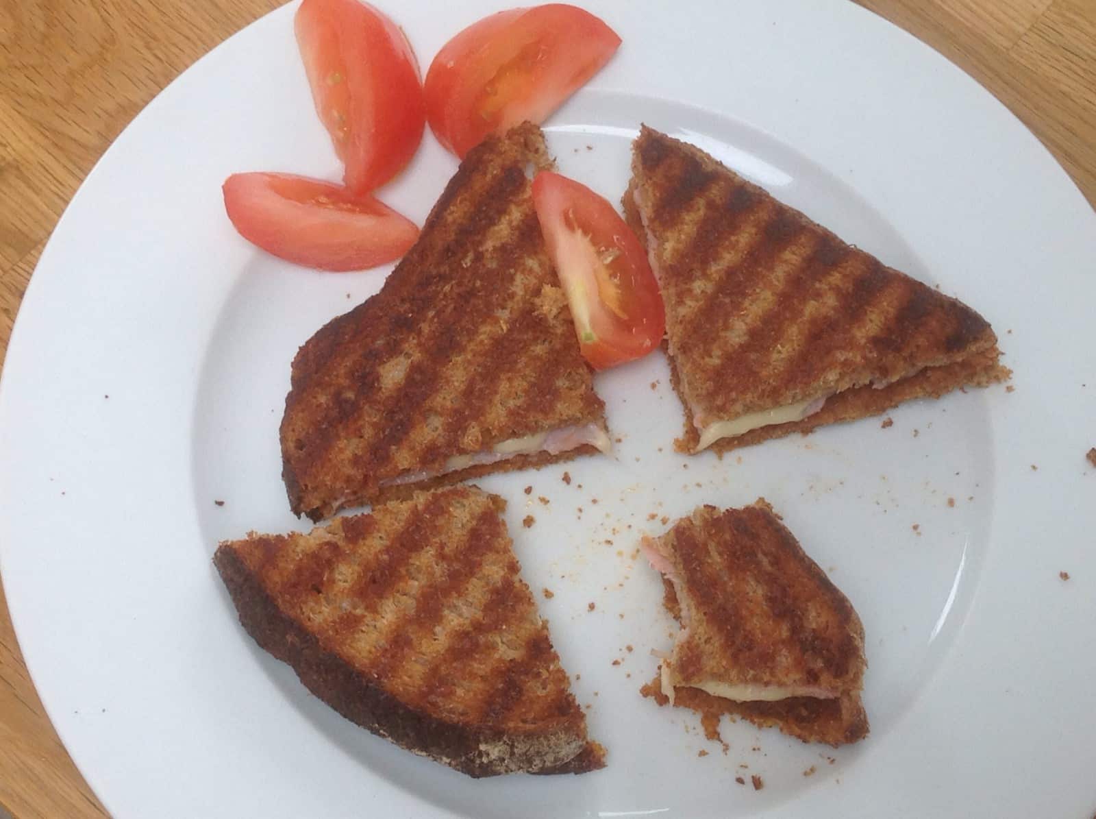 smoked mackerel pate on 3 small slices of sourdough, on a white plate, with quartered tomato