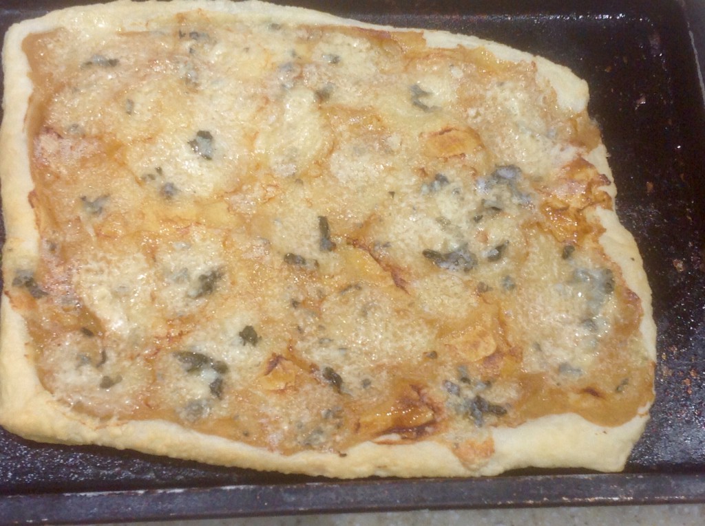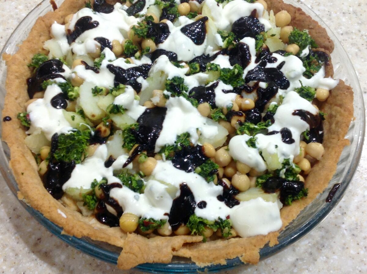 chicken and onion pie, with peas.