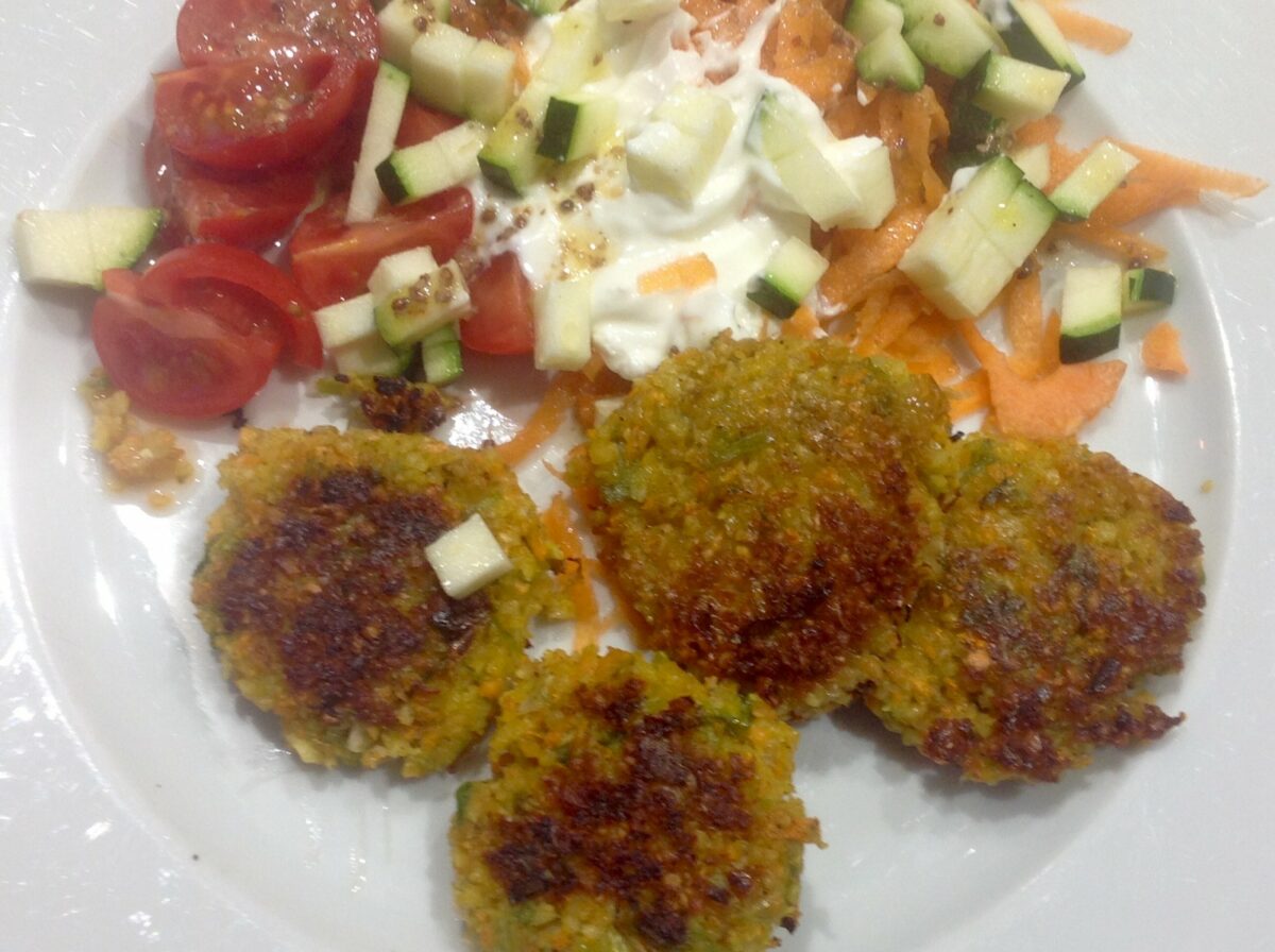 pan fried falafel with carrot and peanut salad.