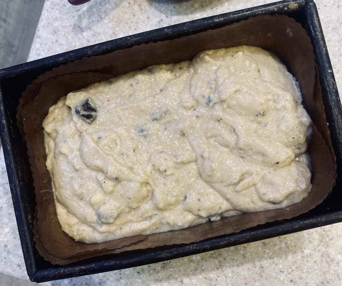 - Pour the mixture into a greased or lined cake or loaf tin. I usually use a 2lb loaf tin as I like to slice it like a loaf