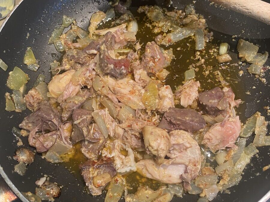 turkey liver, onions, garlic and leftover cooked turkey in small frying pan.
