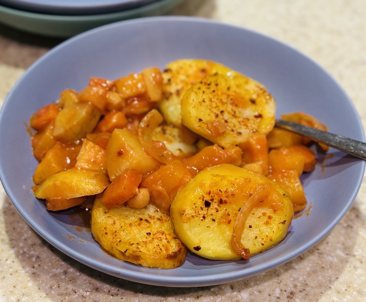 I’ve been wanting to make this particular version for a while now. My granddaughter has come to live with us and one of the things she really likes is potatoes. She doesn’t like oats, so doesn’t like my lovely vegetable crumble which is a bit of a blow, so I thought a sliced potato top on the same base would work  – and it did!