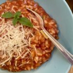 This risotto with tomatoes and basil uses fresh summer tomatoes, from the garden in my case. If fresh tomatoes from garden or supermarket are not available, a tin of tomatoes will do the job almost as well.