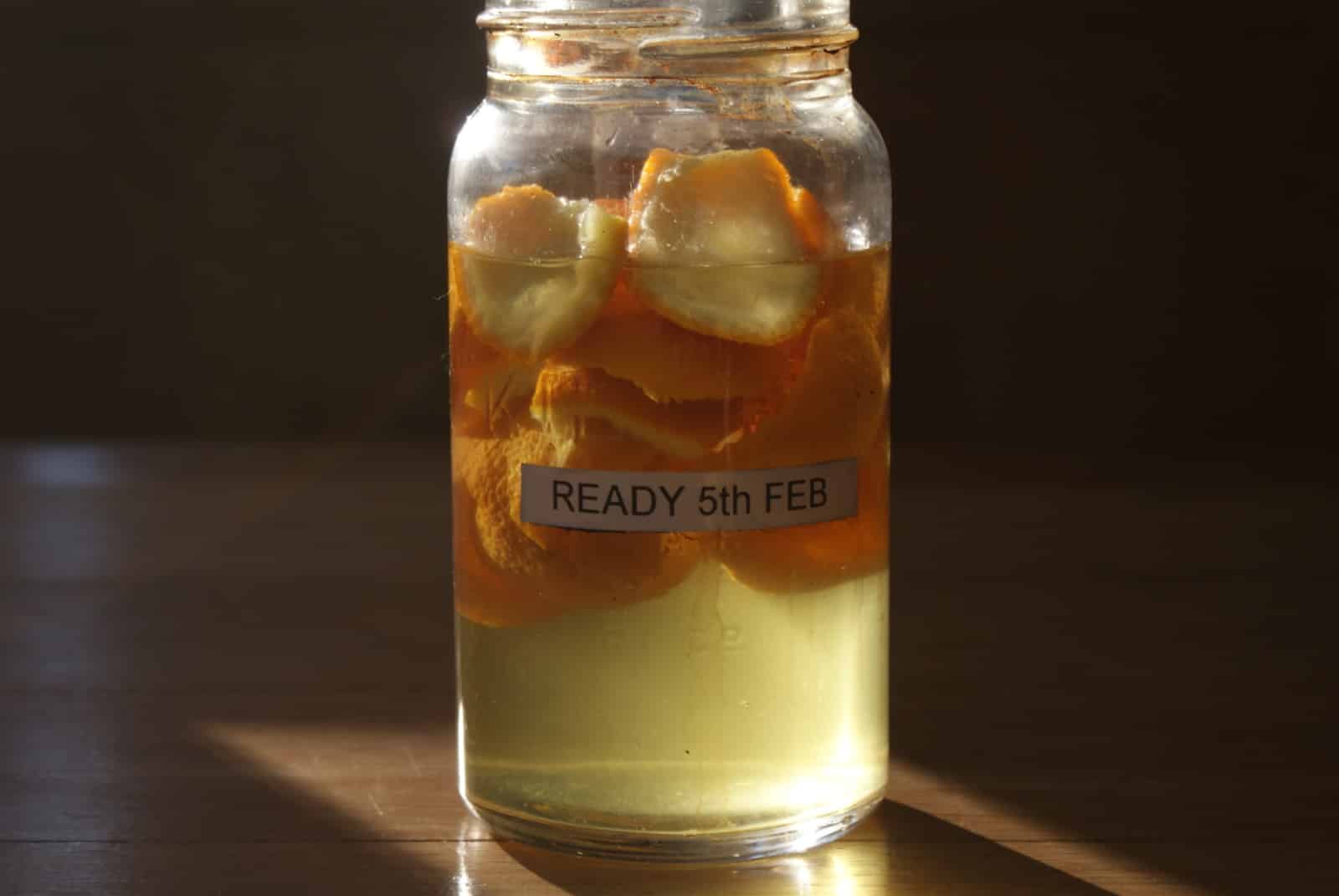 Orange peel soaking in white vinegar to make a cleaning spray – it smells wonderful!